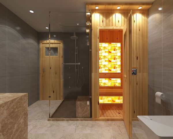 Phòng xông hơi khô thiết kế đá muối là Phòng xông hơi khô thiết kế được kết hợp với đá muối, đây là mẫu thiết kế dành cho các gia đình muốn lắp đặt tại nhà, đem lại cảm giác sang trọng, cao cấp cho người sử dụng. Mẫu phòng này được thiết kế có 3 - 4 mặt được làm bằng gỗ thông nhập khẩu Phần Lan và 1 đến 2 vách được ốp đá muối.